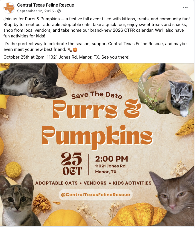 Since August, I’ve partnered with Central Texas Feline Rescue to strengthen their digital presence, increase community engagement, and drive donations in support of their mission to care for and protect cats in Central Texas.