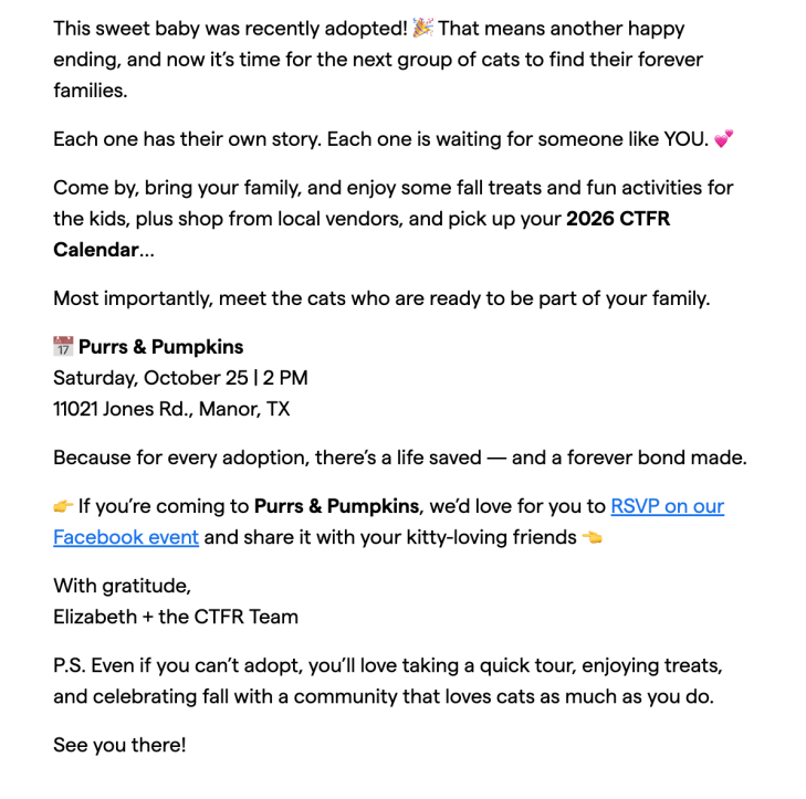 I put together and implemented the marketing plan for an adoption festival, called Purrs & Pumpkins, including all social media, email marketing, website updates, and helping to secure vendors.