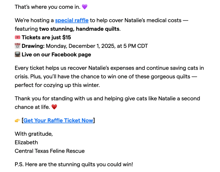“Wow, we got some nice donations yesterday thanks to your post and email — about $2,500. I am thrilled, thank you!”