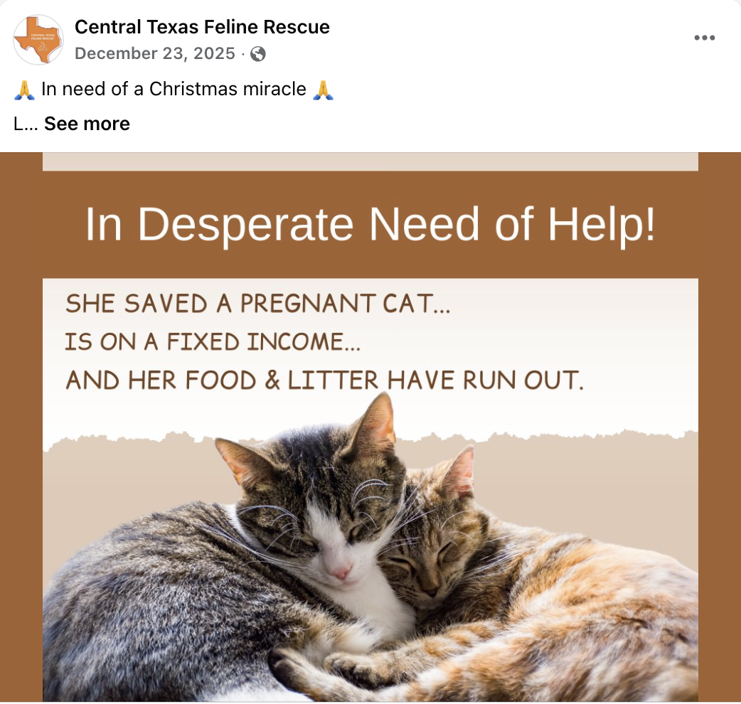 Beyond metrics, this work directly supported individuals and animals in need. After a woman reached out via social media because she had run out of food and litter for her rescue cats while living on a fixed income, community engagement and donations helped ensure her cats would be fed through at least January.