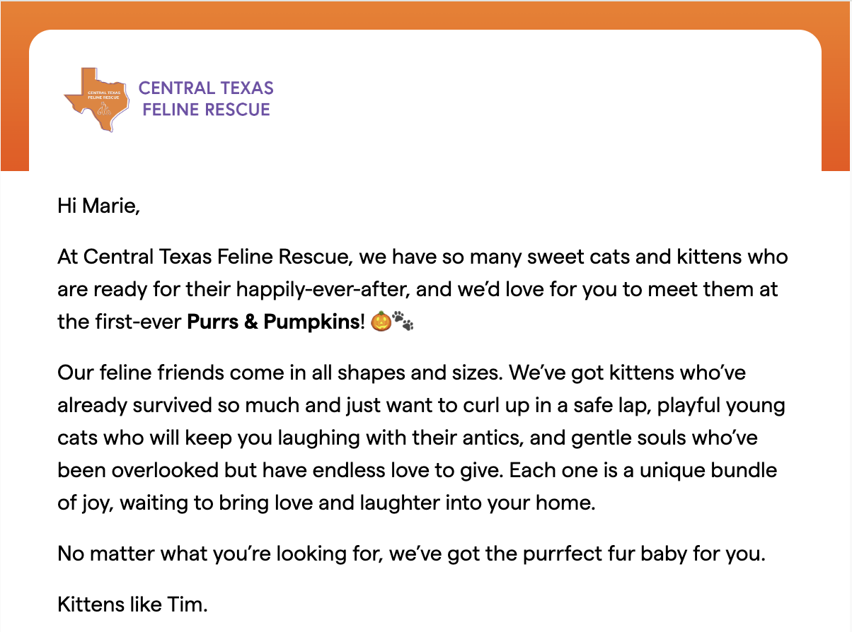 I put together and implemented the marketing plan for an adoption festival, called Purrs & Pumpkins, including all social media, email marketing, website updates, and helping to secure vendors.